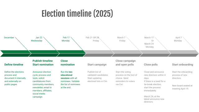 The Board will vote on any changes to be made to the election rules no later than the January meeting, and ideally in the December meeting. OSI staff will then post a list of dates and deadlines, as well as any election rule changes, for the upcoming election.